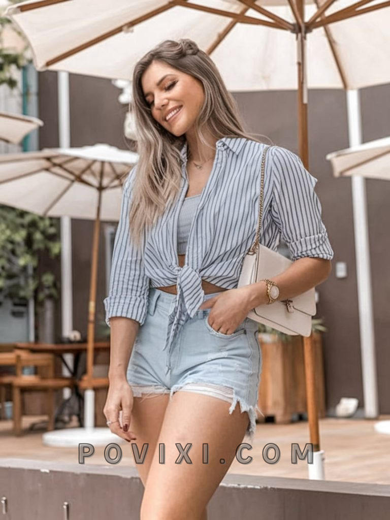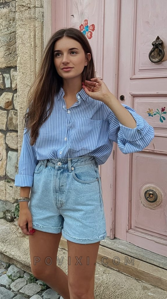 A summer casual essential, this look features a light blue striped button-up tucked into high-waisted denim shorts. The oversized shirt adds an effortless, relaxed vibe, perfect for women casual outfits. Style with delicate jewelry and minimal makeup for a fresh, easygoing appeal. Pair it with neutral-toned sandals or sneakers to keep it simple yet chic. This outfit is ideal for coffee dates, casual office wear, or even a relaxed city stroll.
