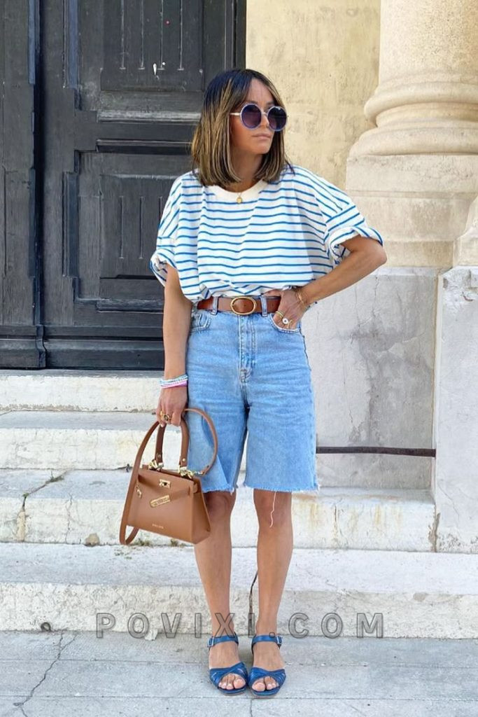 A timeless look that never fails, pairing a white and blue striped oversized tee with light blue denim Bermuda shorts offers a breezy and effortless outfit option. The relaxed silhouette of the top drapes elegantly over the fitted high-waisted shorts, creating a balanced shape that is flattering for various women sizes. The inclusion of a brown leather belt cinches the waist, adding structure and a defined shape. Accessories play a key role in this ensemble, with a structured brown handbag lending an element of sophistication. The addition of blue strappy sandals keeps the look fresh and seasonal, making it an ideal choice for a summer casual day spent sightseeing, shopping, or brunching outdoors. A delicate gold necklace and oversized sunglasses complete the aesthetic, making this a polished yet relaxed outfit choice for 2025.