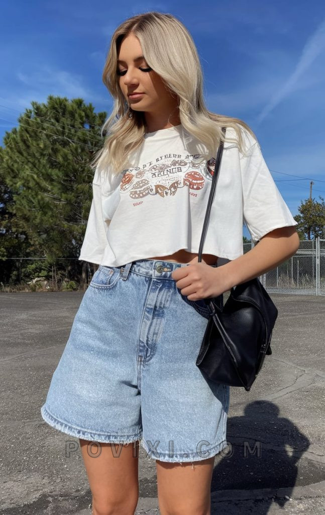 For those who embrace casual fashion with a modern twist, a graphic crop tee paired with baggy denim shorts makes for a comfortable yet stylish combination. The oversized shorts create an effortless streetwear appeal, while the crop tee accentuates the waist, making this a great option for those who love relaxed but put-together looks. The black leather mini backpack adds an urban edge and makes this look practical for day-to-day wear. This outfit is an excellent representation of women summer fashion, ideal for everything from casual hangouts to weekend getaways. The breathable cotton material ensures comfort in warmer weather, while the high-waisted fit of the denim shorts keeps the look trendy and flattering.