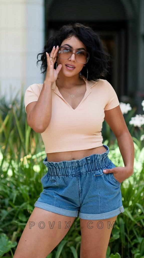 For those who prefer a refined yet casual outfit, this combination of high-waisted paper bag denim shorts and a neutral-colored cropped polo is a perfect mix of sophistication and comfort. The structured waistline of the shorts creates a flattering silhouette, while the cropped polo keeps the look youthful and sporty. Accessories like oversized sunglasses, gold jewelry, and a small crossbody bag enhance the preppy aesthetic, making this outfit an excellent choice for brunches, day outings, or casual office days. The balance between the structured shorts and the relaxed top ensures a polished yet effortless appearance that feels fresh and modern.