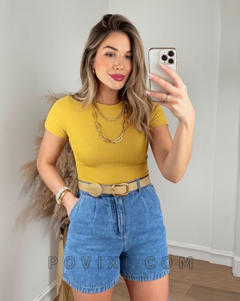 For those who love making a statement, a yellow fitted tee tucked into high-waisted denim shorts is a vibrant and playful way to embrace color in 2025. The matching yellow belt ties the look together seamlessly, adding a bold and coordinated touch. The contrast between the fitted top and the slightly looser shorts creates a well-proportioned silhouette that flatters various women sizes. This look is an excellent example of women summer fashion that incorporates color without overpowering the ensemble. Whether for an outdoor event, a coffee run, or a fun summer photoshoot, this outfit is a go-to for anyone wanting to inject some brightness into their wardrobe.