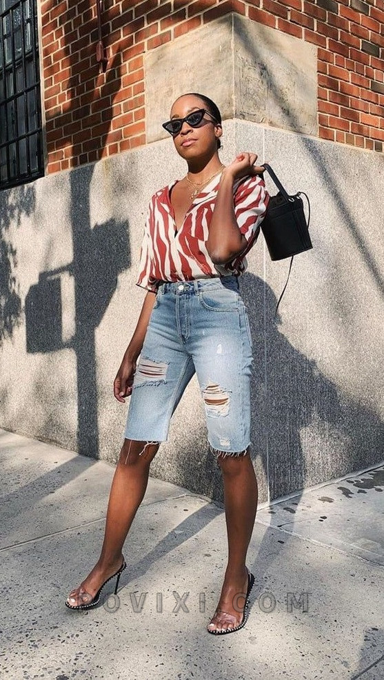 A bold baddie look featuring a knee-length pair of ripped denim shorts, a striking patterned blouse, and black women-inspired edgy accessories like cat-eye sunglasses and a structured mini bag. Pairing with black heels adds an unexpected twist, elevating the entire outfit from casual to high fashion. This outfit is ideal for an urban street-style moment, perfect for city exploring or a fun night out. To complete the look, add a sleek ponytail and minimalistic jewelry.
