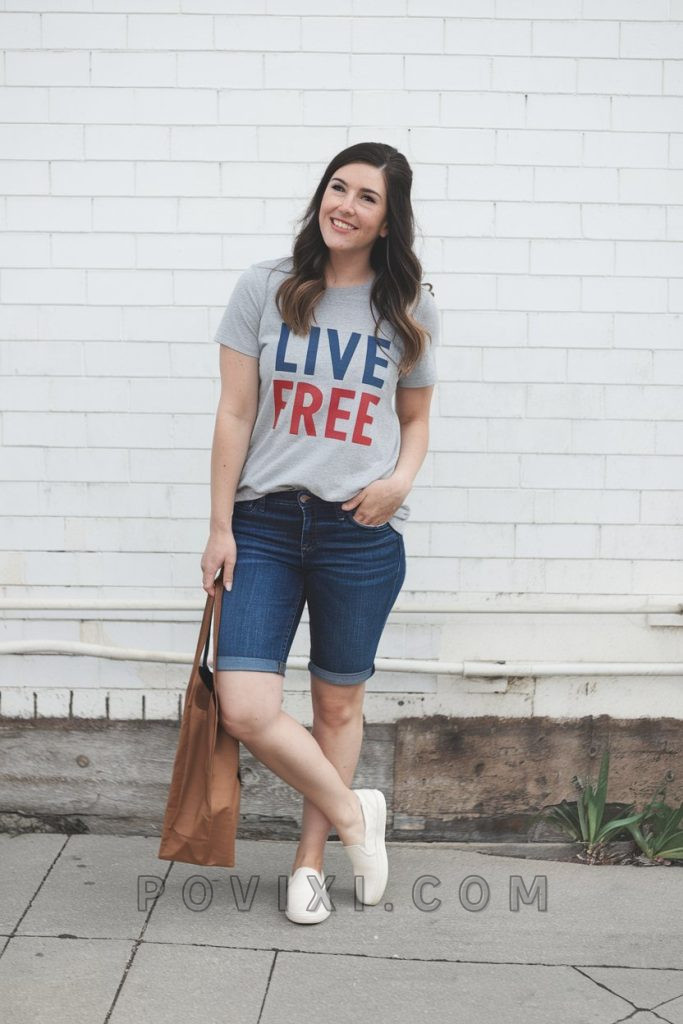 For those who love an effortless casual aesthetic, this combination of a graphic tee and bermuda denim shorts is an instant classic. The knee-length cut of the denim offers a comfortable fit, making it perfect for active days when you’re on the move. Paired with white slip-on sneakers, this look embraces the laid-back charm of summer casual dressing while staying functional and stylish. The canvas tote bag adds practicality, making it a great choice for everything from farmers’ markets to road trips. With its versatile appeal, this outfit works well for a variety of occasions.
