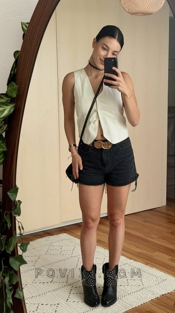 Channeling a touch of Western charm, this outfit consists of a white vest paired with black denim shorts and a statement belt. The combination of light and dark tones makes this look effortlessly stylish, while the studded black boots add a rugged, adventurous feel. This is an outfit that embraces individuality and modern fashion, blending women casual elements with striking details. Whether worn at an outdoor event or a casual evening gathering, this stylish pairing brings personality to any occasion. The structured vest enhances the look’s overall polish, while the relaxed fit of the denim shorts keeps things laid-back and comfortable.