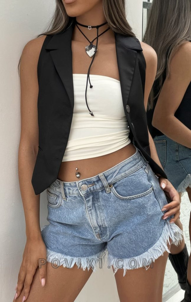 For those who enjoy a more polished yet bold approach, a black vest over high-waisted light blue denim shorts creates a sleek and confident look. The structured cut of the vest gives the outfit a tailored feel, contrasting beautifully with the more relaxed fit of the shorts. The result is a fusion of business-chic and casual streetwear, a style that can easily transition from day to night. The clean-cut lines of the vest, paired with delicate jewelry and minimalistic accessories, add a sophisticated touch to the entire ensemble, proving that denim shorts can be dressed up for more formal occasions.