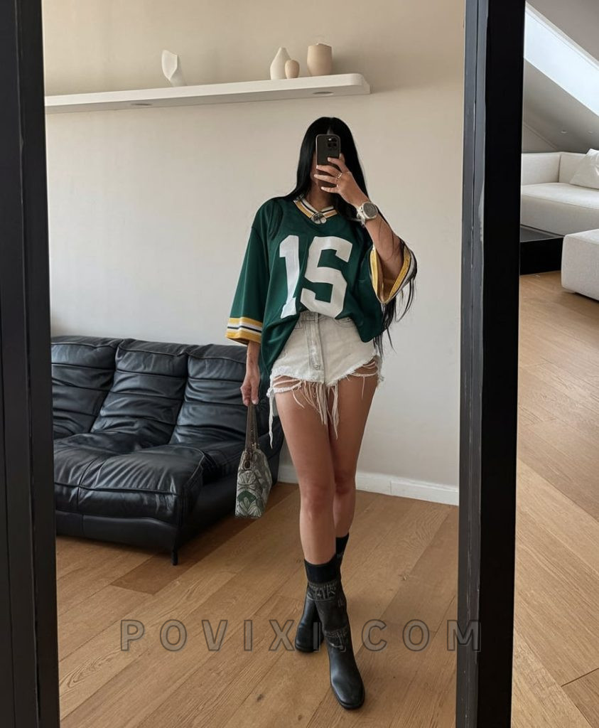 Combining baggy ripped denim shorts with an oversized jersey creates a sporty, streetwear-inspired ensemble. The dark green jersey introduces a masculine, menswear-inspired aesthetic, while the distressed shorts keep it feminine and bold. Black cowboy boots add a rugged charm, blending vintage Western influences with contemporary street style. This look is perfect for casual outings, music festivals, or making a statement with unexpected pairings. By mixing textures and silhouettes, it creates a dynamic outfit that turns heads while staying effortlessly cool.