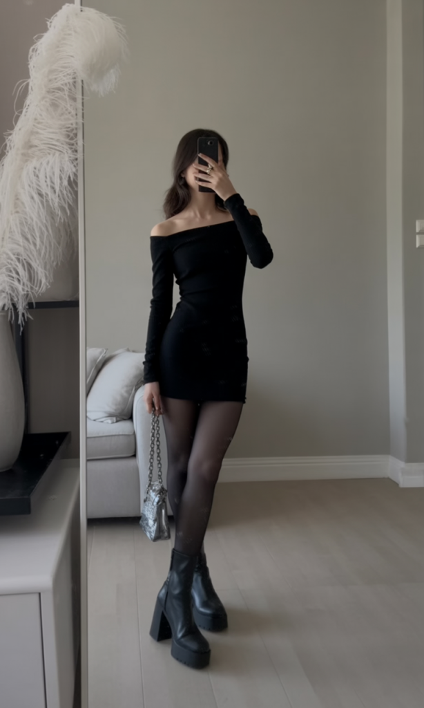 10. Off-Shoulder Black Mini Dress with Platform Boots