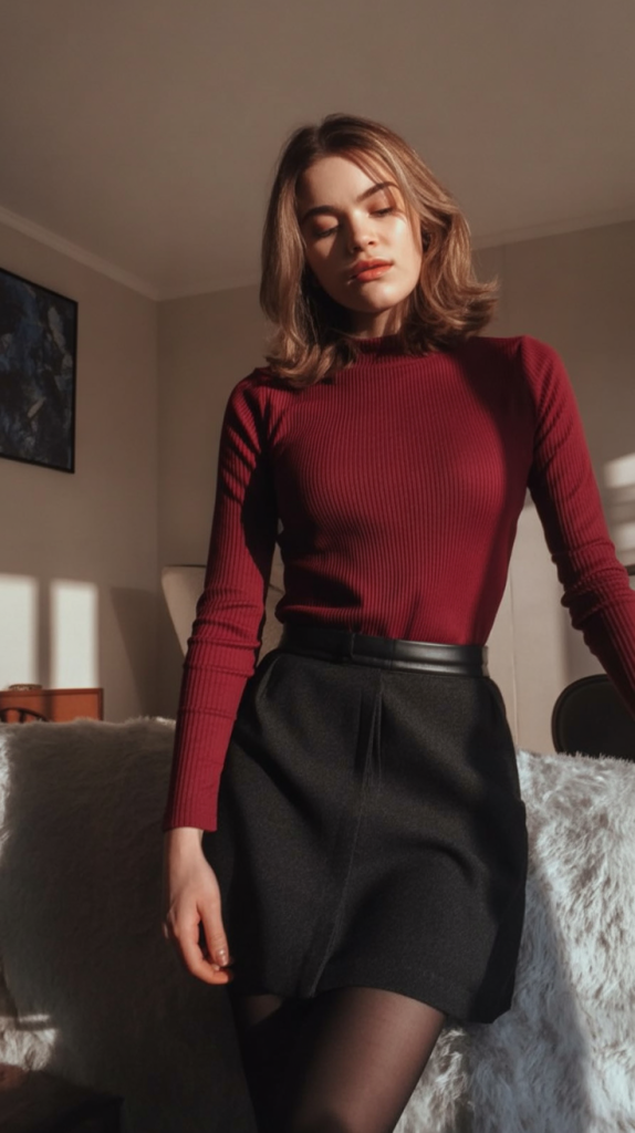 An old fashioned way of combining a rich burgundy top and a smooth black skirt is timeless to some degree. The color combination is cozy and festive, which is why it is a perfect choice in new year casual outfits. The appearance is not overloaded and has a more refined and simplistic touch that can be worn in a nice night dinner or in a relaxed house party.
