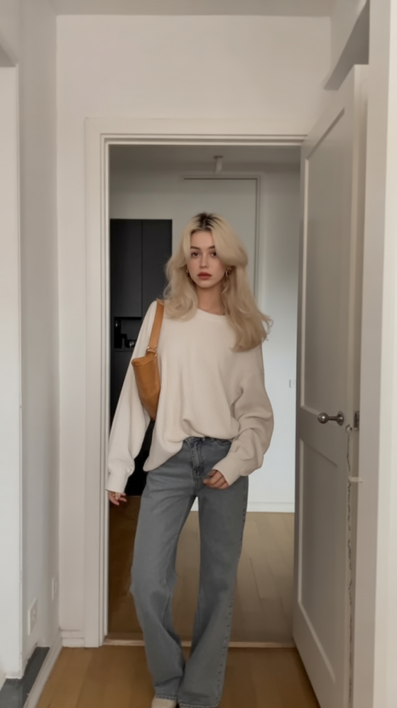 This is a particularly flirtatious appearance that suits women who enjoy comfort combined with statement items. It is loose fitting thanks to an oversized sweater and the sequins add that fancy evening shine. It’s a clever idea in 2025- fancy enough to party but not so fancy that you feel awkward.
