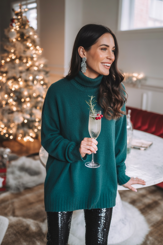 There is no more celebratory than a jewel sweater with sequins. This knit, designed with shimmering black pants, is holiday warm even in this emerald green shade. It is one of those informal New Years Eve dresses that are warm but at the same time shiny since it suits well in house party events.