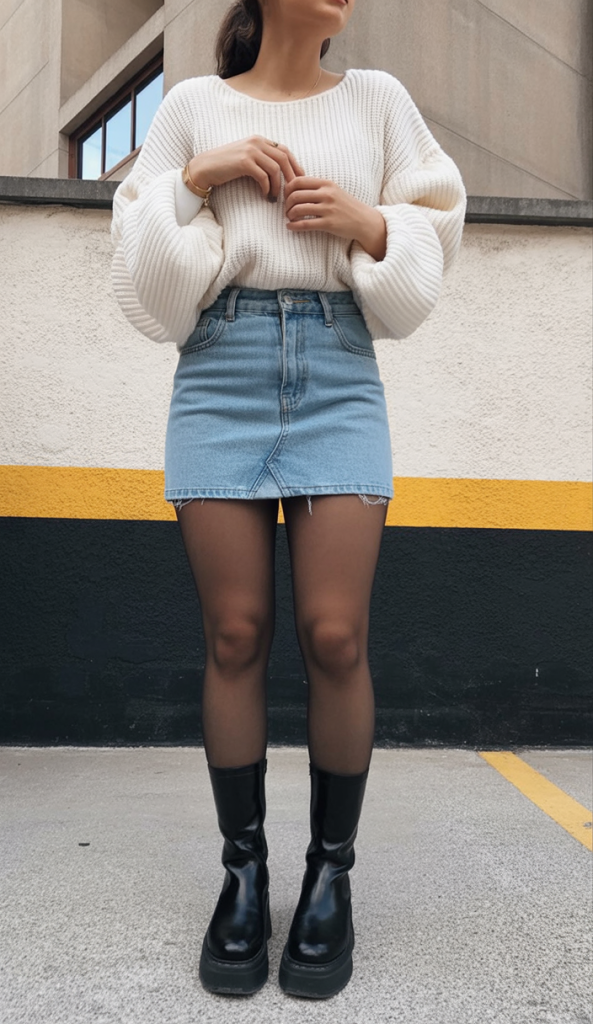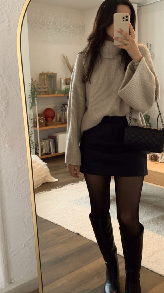 This outfit demonstrates how a mini-knit can make an immediate upgrade of a mini-skirt. The light beige sweater is hidden under a sleek black skirt which is in a perfect contrast and tall boots and quilted bag are used which add sophistication. It is an upscale evening view that is contemporary and friendly.