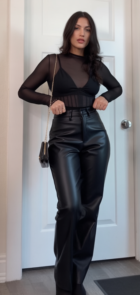 Black is always bold, but when leather pants are together with a sheer, off-shoulder top, the style is put on a higher level. It is daring, shiny and has that I did not work very hard but still I look great appearance that women take pride in regarding casual New Year outfits. It is sultry and wearable, ideal to 2025 celebrations that are more about style than bling.
