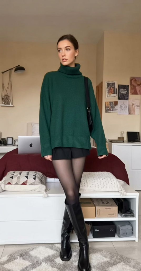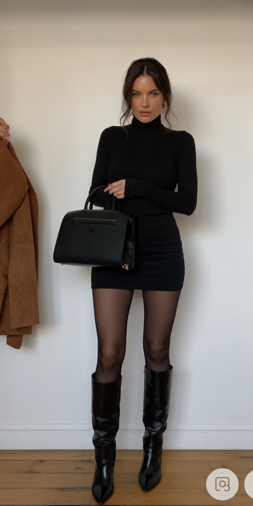 It is a fabulous outfit that suits women who prefer a classy yet comfortable night feel. It is suitable in house party get-togethers, in the open air or even a quick restaurant meal. The boots and tights make it intelligent and wearable in the rain and snow so it is among the most flexible concepts in 2025.