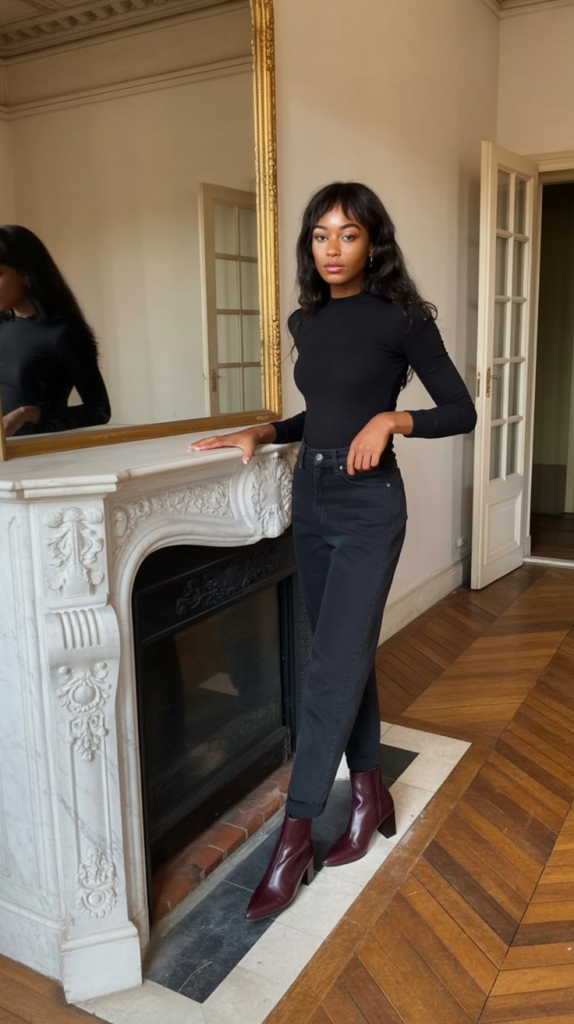 It is quiet glamour how a tight black turtleneck is combined with jeans and heeled boots. It is neither too fancy nor too casual to be worn in the event of a jeans holiday party yet it is still smart enough to be considered classy. The minimal palette and clean lines provide it with a Parisian-inspired touch, ideal in women who want to remain stylish without making any effort.