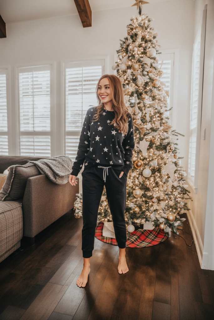 Not all New Years Eves are full of glittering dresses and high heels- sometimes it is all about home comfort. The final piece of clothes to a house party or a family gathering is a star-print sweater worn with cozy joggers. It is adorable, casual and has a holiday vibe without compromising on comfort.