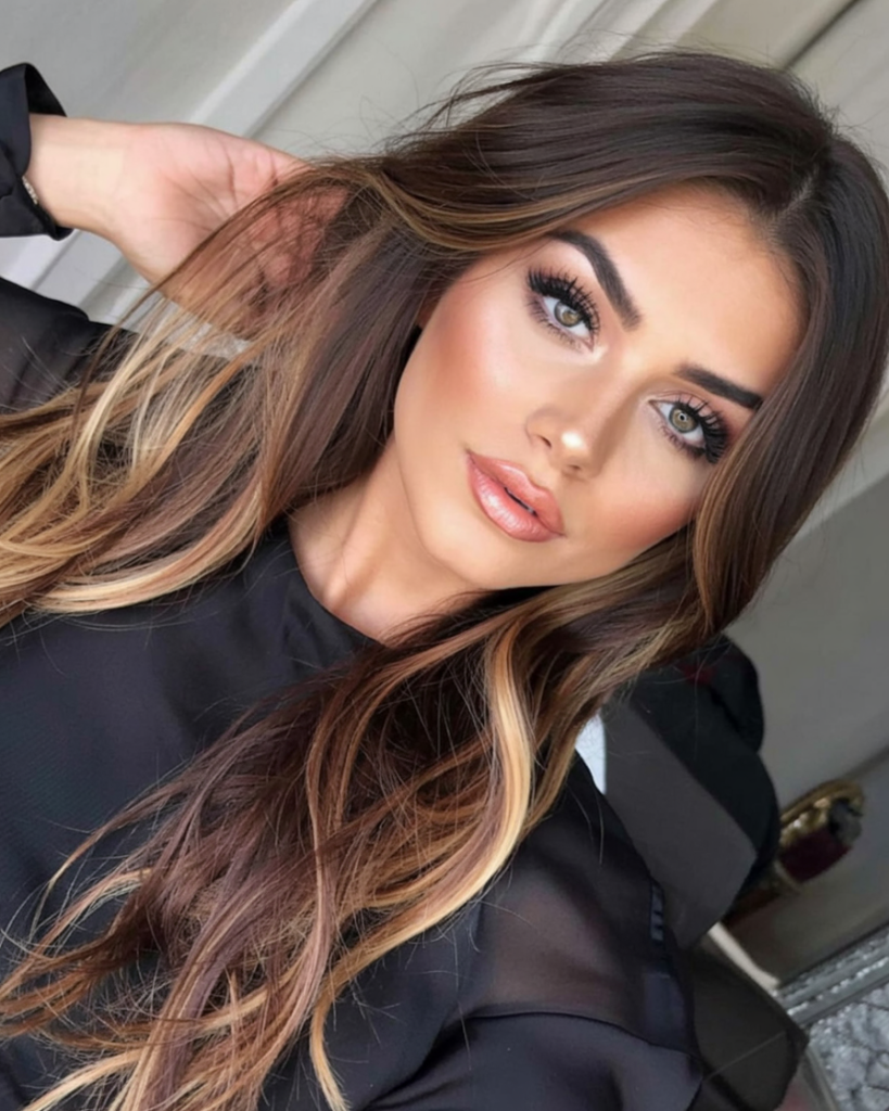 These fall highlights on brown hair 2025 are perfect with straight or slightly wavy hair, and, in particular, the users with a naturally darker base. Mousse the hair and then blow dry on a round brush so the color will pop out or you can straighten on a flat iron, but that is more dramatic and sleek.