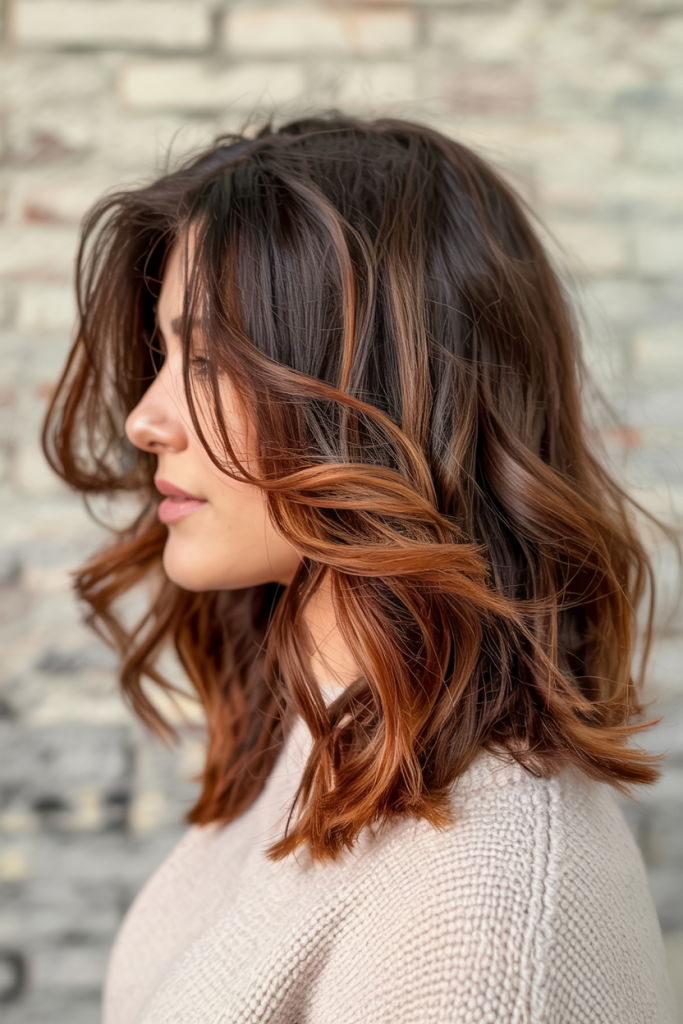In case you want a color change but do not want it to seem drastic, then this copper-toned brunette is the thing. The Caramel and red colors showing through it lend this style more of a cinnamon coziness that is very flattering on any skin type, especially in fall during golden hour.