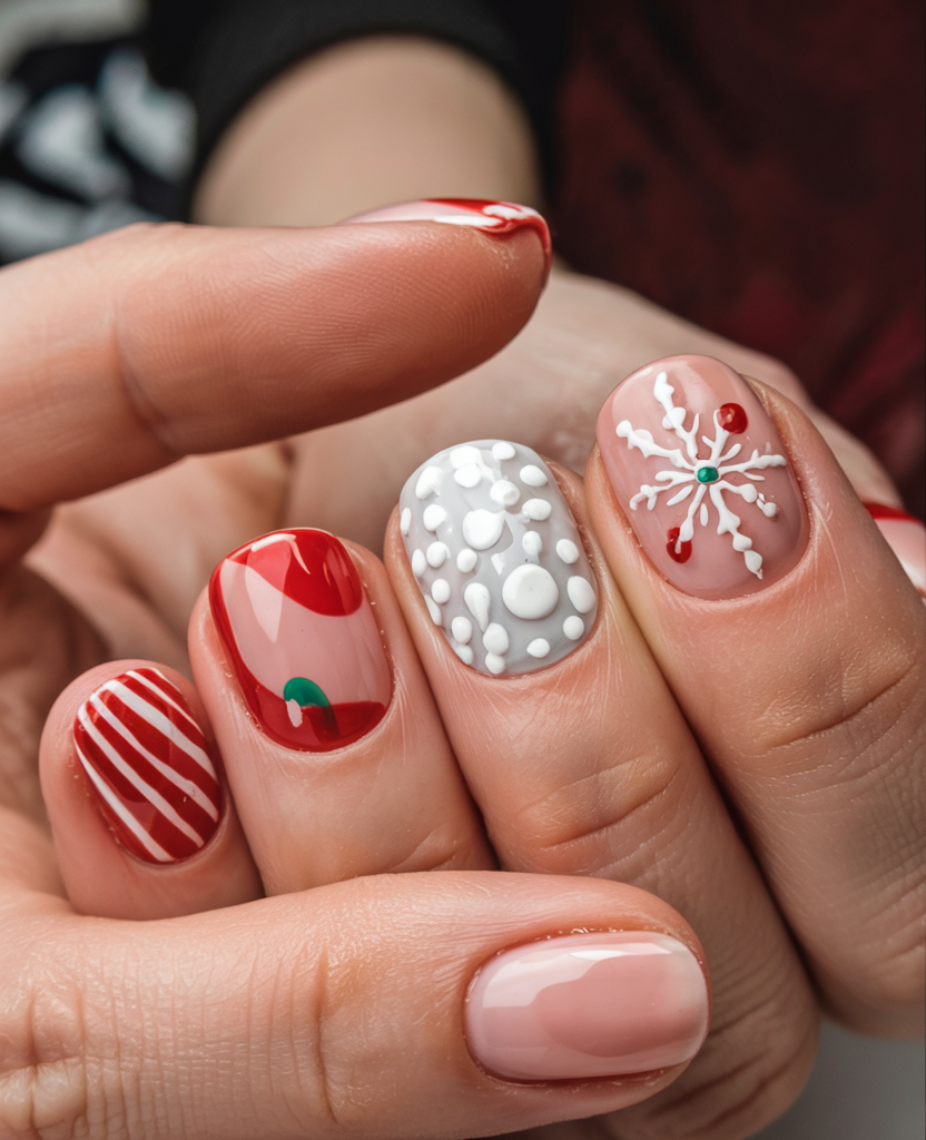 Bold red candy stripes, white 3D dots, and snowflake accents combine in this joyful short nail design. It’s the perfect blend of playful and chic, with a mix of matte and glossy textures that make each nail unique. This manicure feels like a holiday party wrapped up in one set—festive, bright, and full of personality.