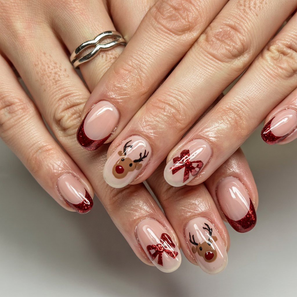 This look works beautifully on short almond nails, especially for anyone who loves festive designs that are still easy to wear day to day. The red glitter tips add a touch of glam while keeping the base natural, so it pairs effortlessly with both cozy sweaters and party outfits.