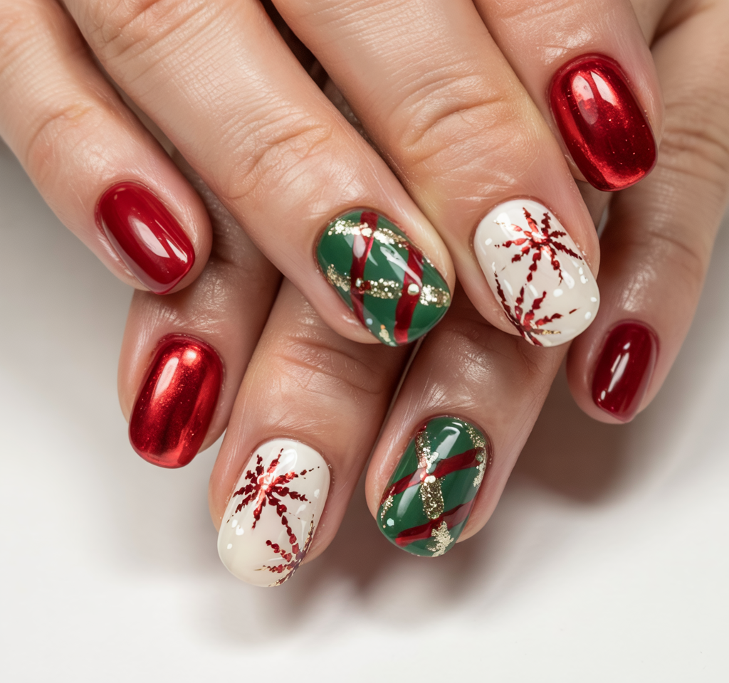 This design works best on short rounded or oval nails, making it comfortable and practical. The different patterns on each nail give it a lively, dynamic feel, while the cohesive color palette keeps everything harmonious. It’s a go-to option for anyone who loves extra festive vibes in 2025.