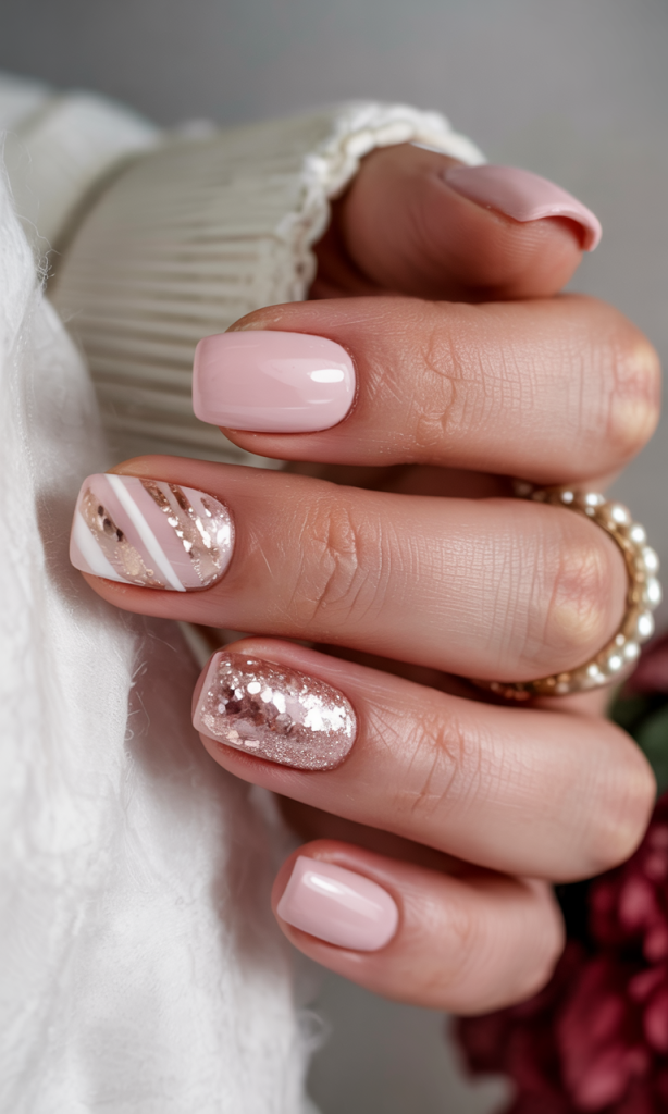 For a softer, more romantic holiday manicure, this blush and rose gold combo is simply stunning. The mix of shiny pink polish, glitter accents, and subtle white striping gives a modern yet festive feel that’s perfect for winter celebrations. It’s a look that whispers “elegance” while still shining bright.