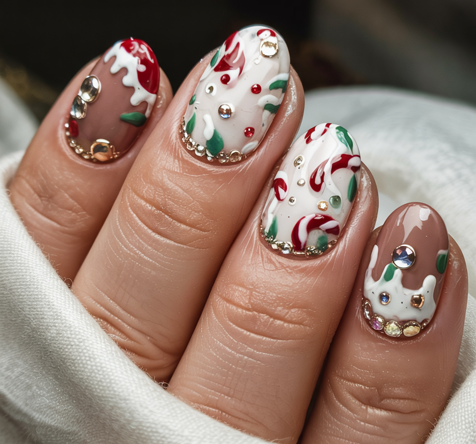 This design is for those who adore acrylic or gel finishes and are confident enough to make a statement. The bold almond shape adds elegance, and the bling makes it a statement manicure for Christmas dinners and parties. This look, compared to simple ideas, embraces extra sparkle and is perfect if you want your nails to be as festive as your outfit.