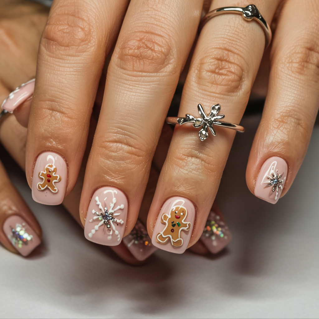 16. Gingerbread and Snowflake Short Christmas Nails 2025