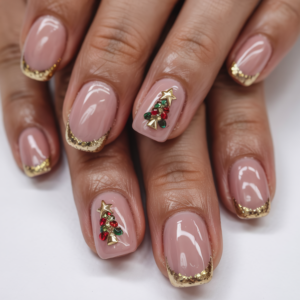 These short christmas nails 2025 bring luxury into holiday nail art. With golden French tips and jewel-like Christmas tree accents, the look is chic and festive in equal measure. The glossy nude base keeps it classy, while the metallic details add just the right amount of sparkle for holiday celebrations.
