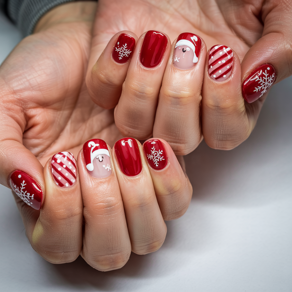 Bold red polish meets playful Santa hat art and snowflakes in this cute set of short Christmas nails. The mix of classic candy stripe designs and minimalist characters gives a joyful, lighthearted vibe—like holiday pajamas in nail art form. It’s the kind of manicure that brings instant cheer, perfect for parties, cookie swaps, or just making everyday moments feel a little more magical.
