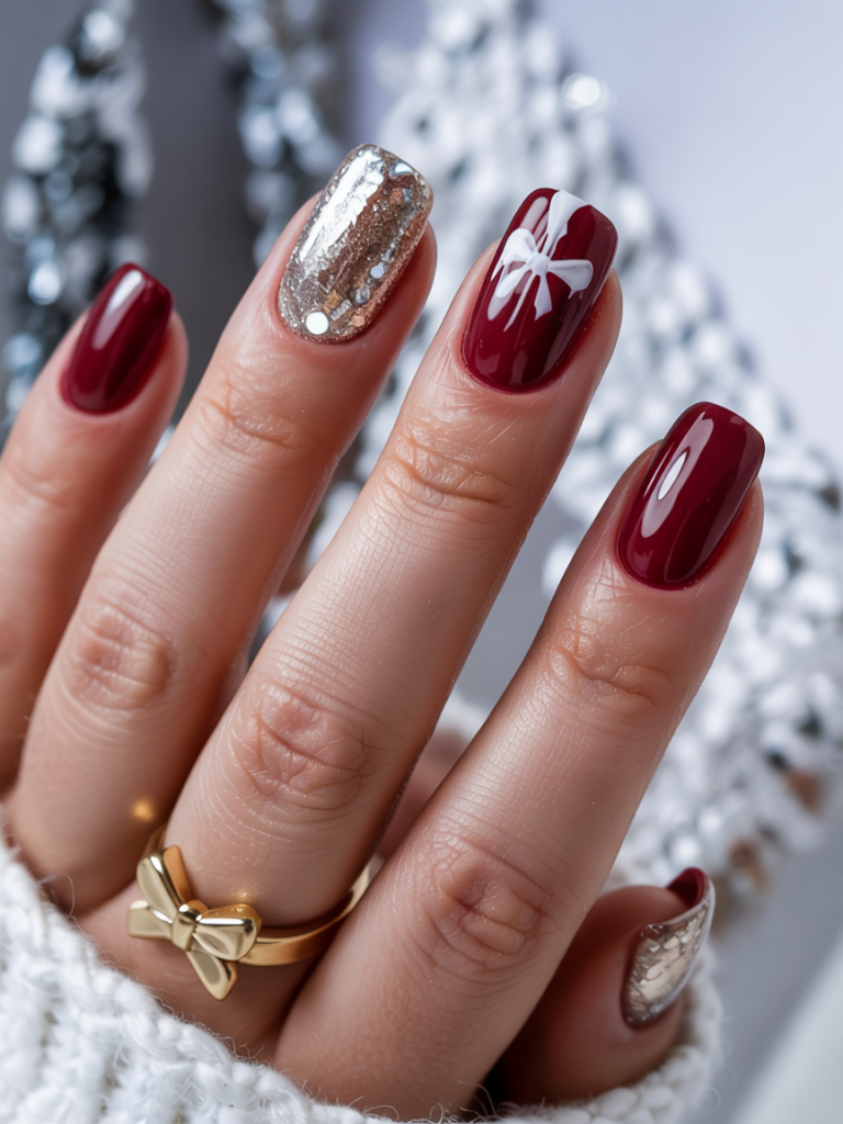 Short christmas nails 2025 don’t get more festive than this red and gold combo with a delicate bow accent. The deep red polish adds warmth and sophistication, while the shimmering silver glitter nail feels like holiday sparkle wrapped up in ribbon. This manicure captures that perfect balance of classy and cute, making it a go-to choice for December celebrations.