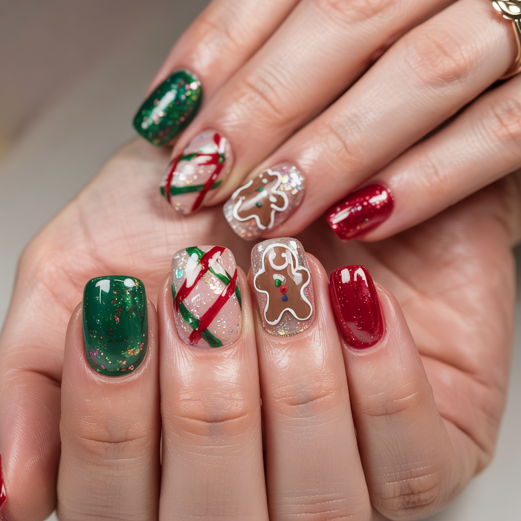 Playful and nostalgic, this short nail design mixes gingerbread men, candy cane stripes, and red-and-white patterns with a touch of gold glitter. The overall look is pure holiday joy—like unwrapping gifts under twinkling lights. It blends detailed art with a soft base that keeps the set looking fresh and polished rather than overwhelming.