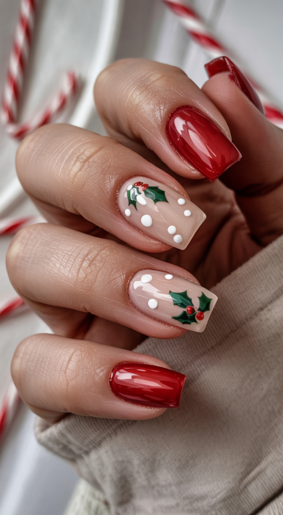 4. Red And Holly Leaf Square Christmas Nail Designs 2025
