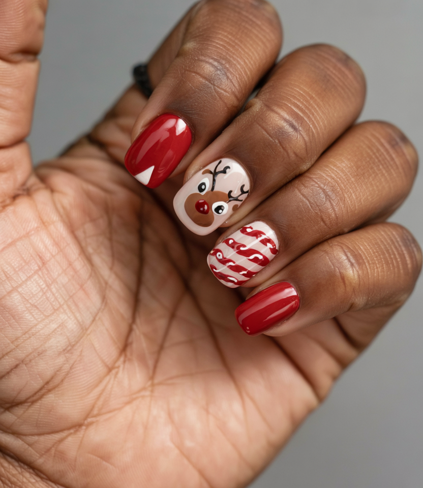 5. Rudolph Candy Cane Short Christmas Nails 2025