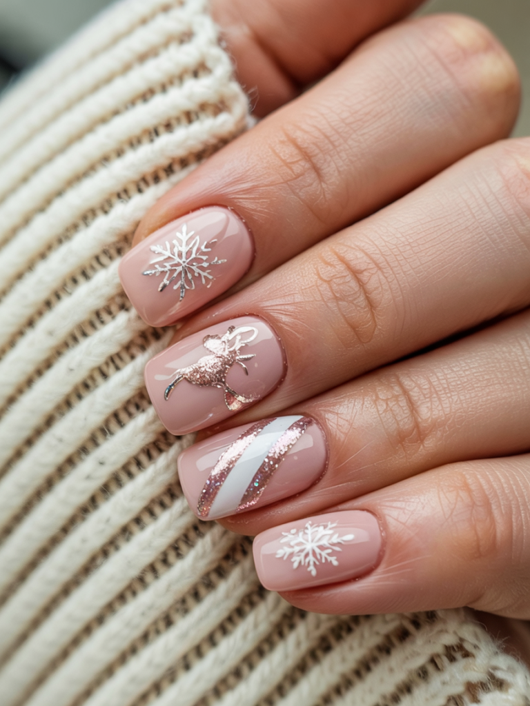 If you’re drawn to a mix of modern shimmer and classic holiday art, this short nail design is a showstopper. The combination of rose gold glitter stripes, delicate white snowflakes, and a graceful reindeer creates a balanced look that’s festive but not overdone. It has a soft, cozy sweater vibe that pairs beautifully with winter knits and gold jewelry.