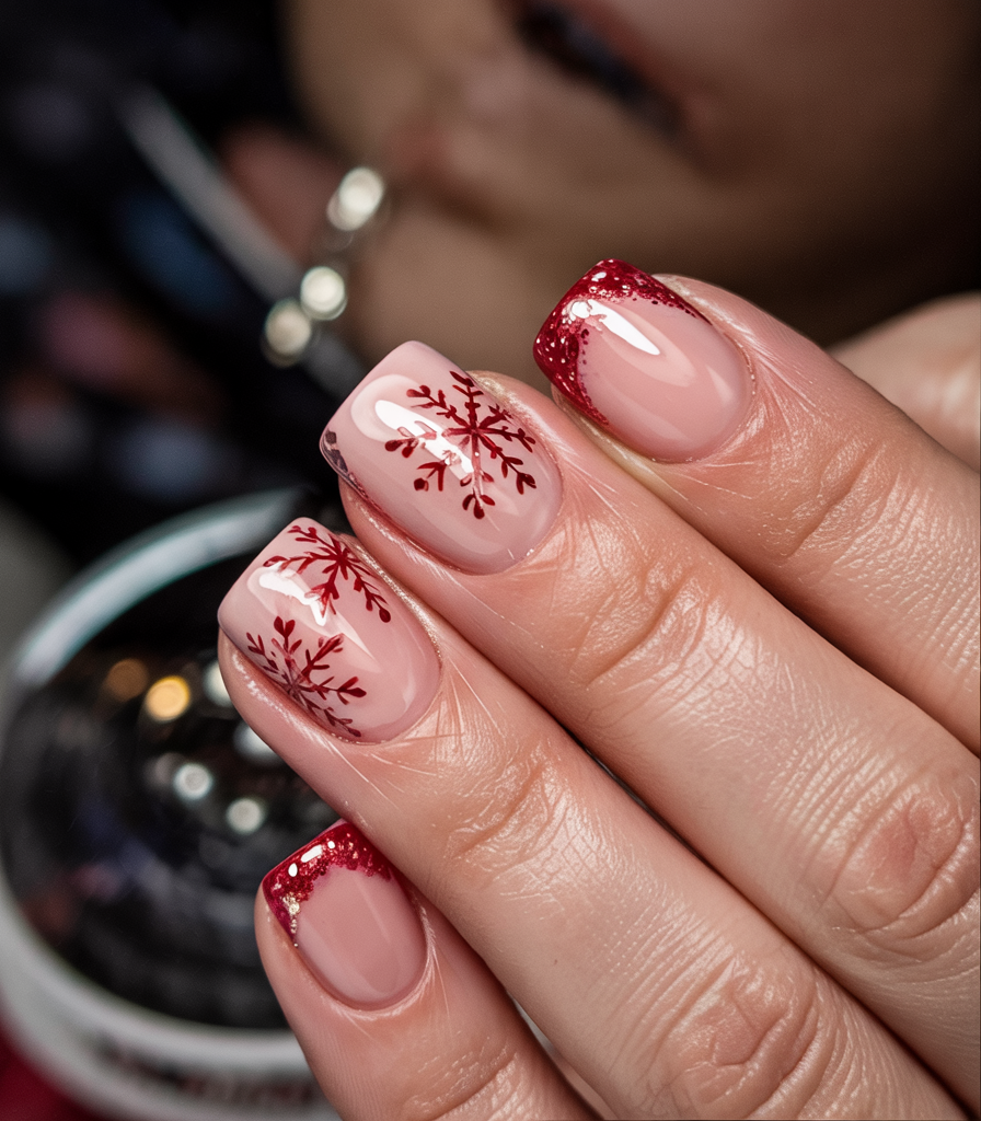8. Red Snowflake French Tip Short Nail Designs 2025