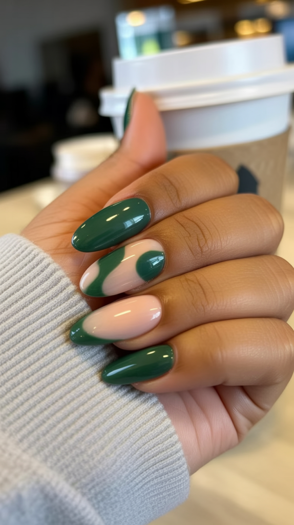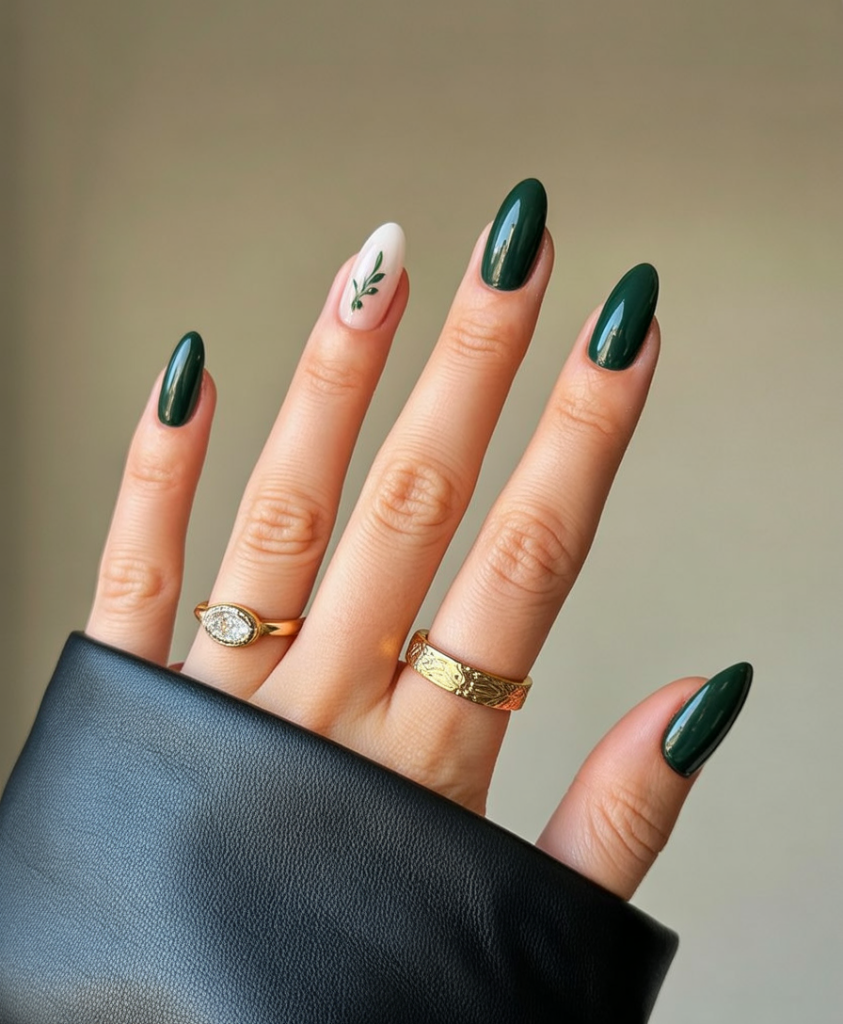 1. Dark Green Almond Nails with Minimal Leaf Accent