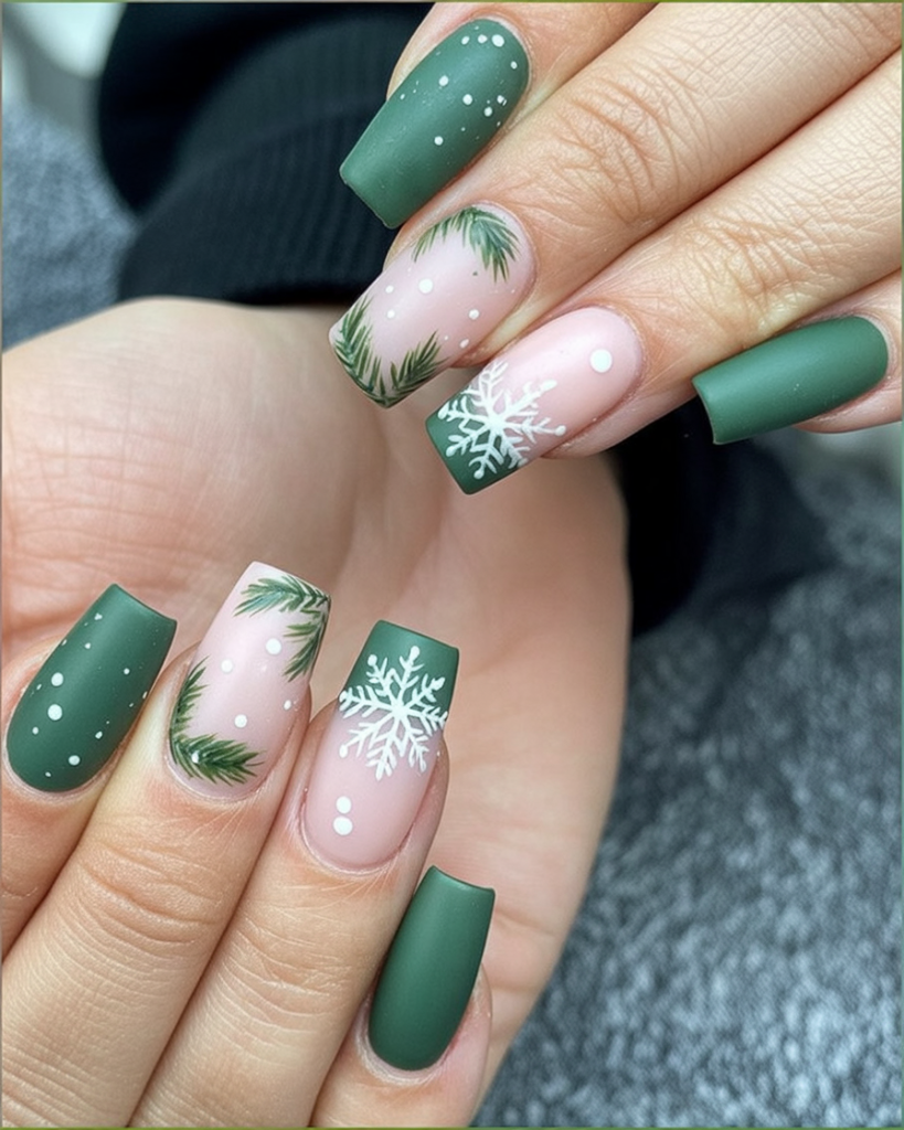 10. Matte Green Square Nails with Snowflake and Pine Art