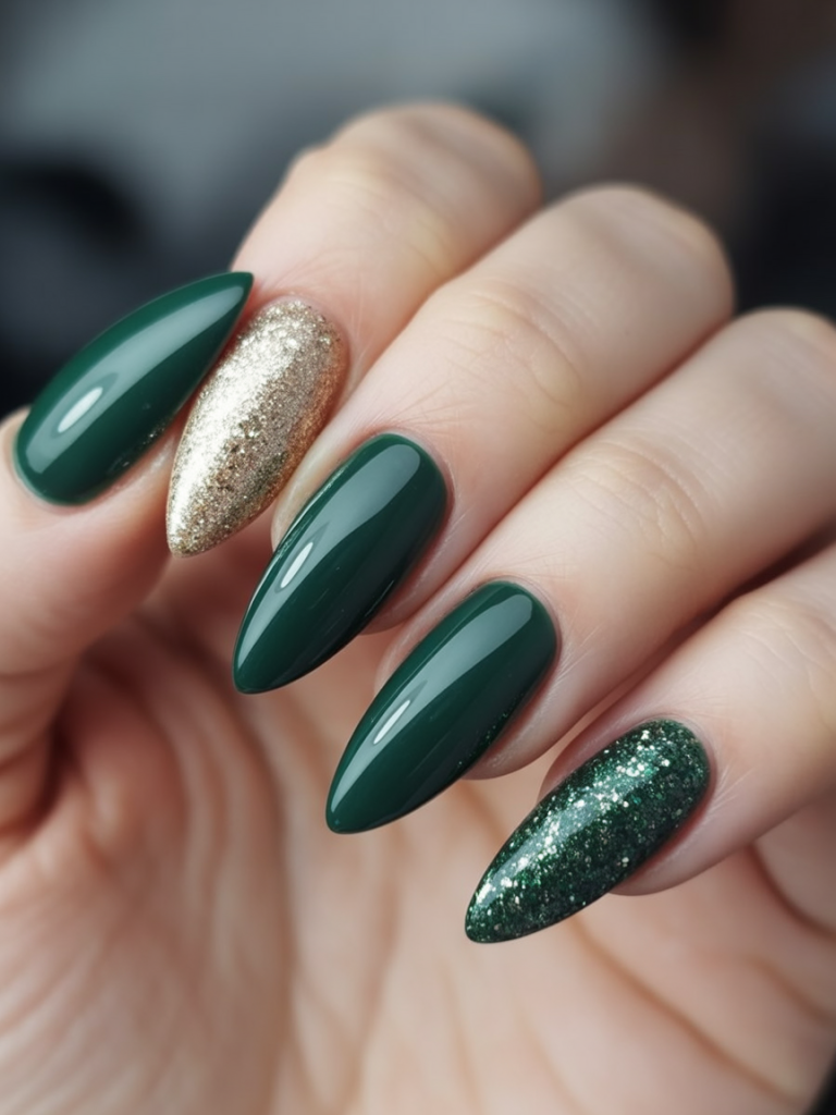 Dark green nails combine with a golden sparkle to create this stunning set, where the almond tips feel joyful yet elegant. This green glossy nail paired with a gold glitter mainly accent nail nails the look that is still classic yet perfect for the Holiday season. Bold but respectful—the perfect blend of glam and austerity, quite simple.