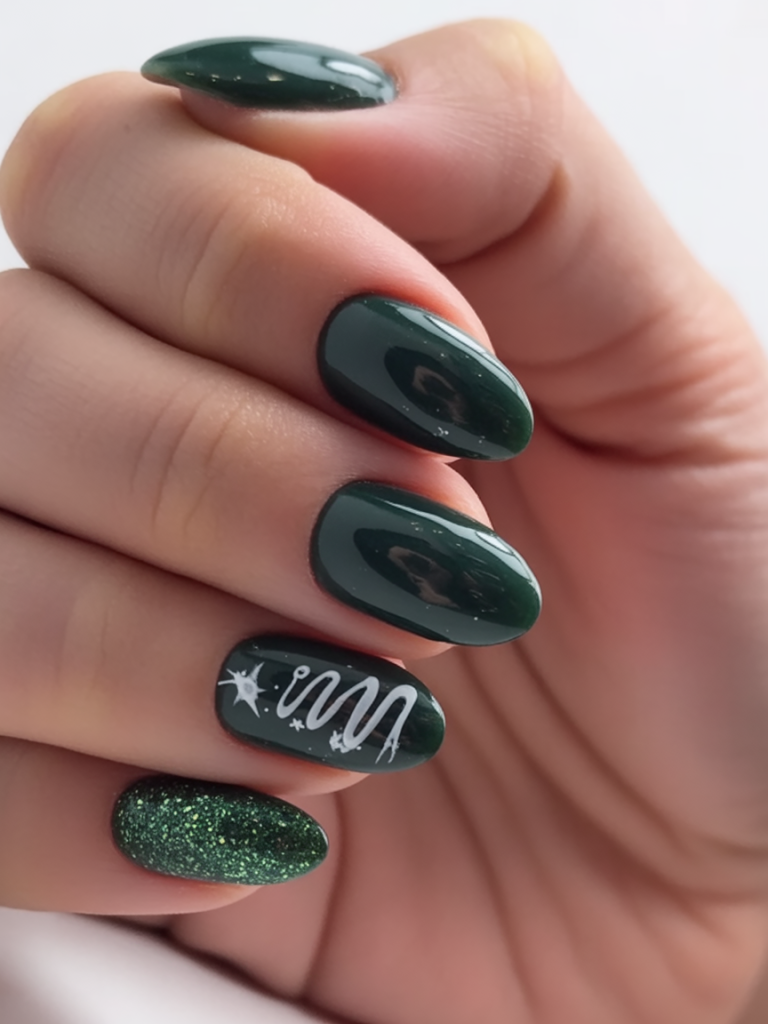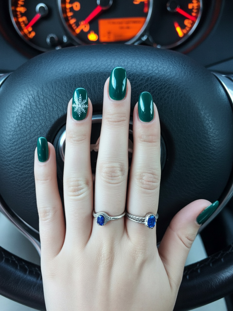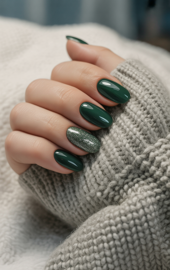 Sometimes, the best holiday manicures are the ones that stay sleek with just a hint of sparkle. These deep green nails are softened by rounded edges, with the subtle glitter accent nail letting out a little shimmer minus the spotlight. It is elegant, understated, and totally wearable — in case you want those Christmas nails to take you through into the new year.