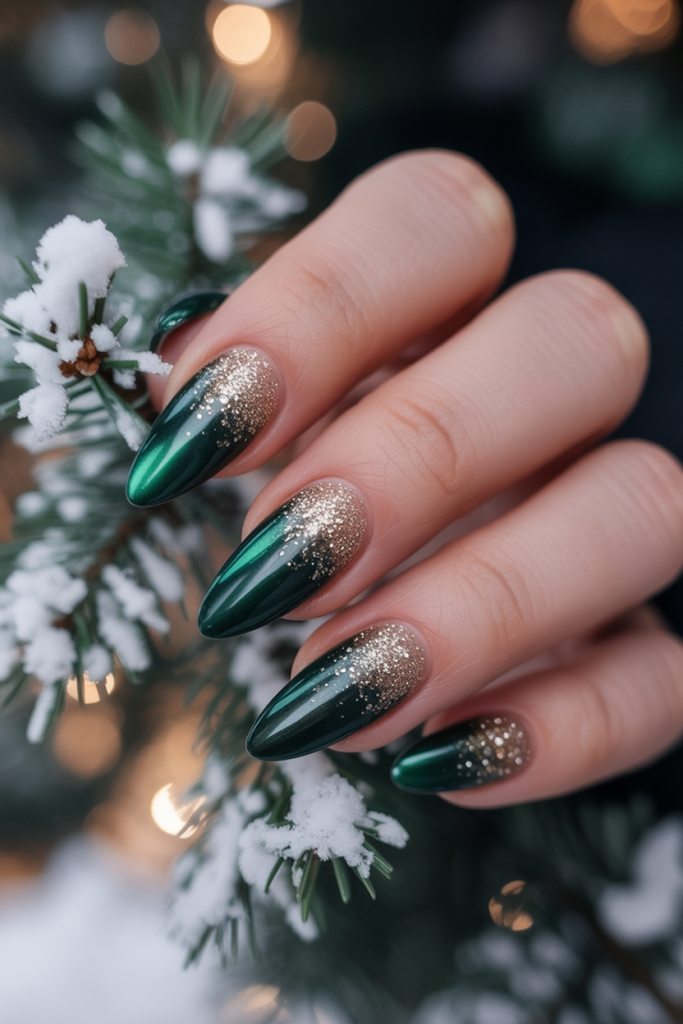 There are the Christmas-evening nails: deep dark green polishing into glitter-burnished-gold tips. The whole money-and-glitter-like, ombre will convey impressions of lights twinkling against the backdrop of a forest. They are festive, dramatic, for someone who wants to make an appearance with her nails.