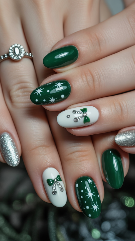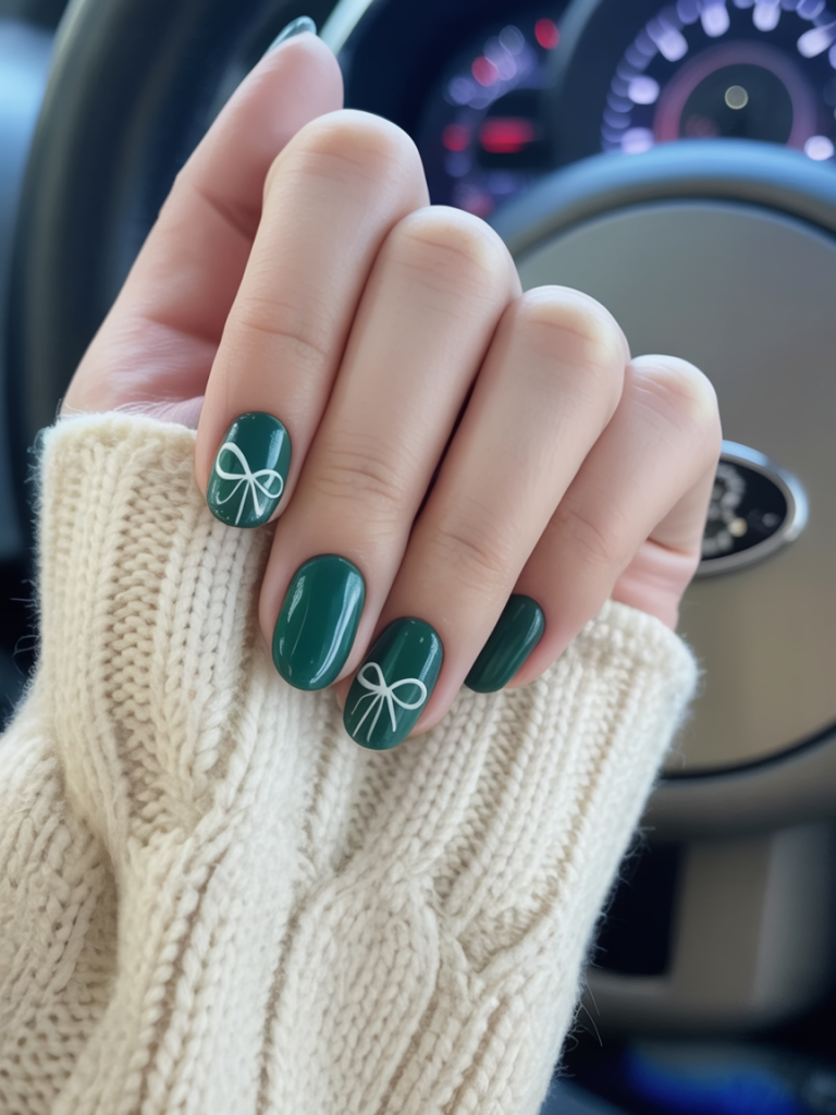 6. Dark Green Gift Wrap Nails with White Bow Accent