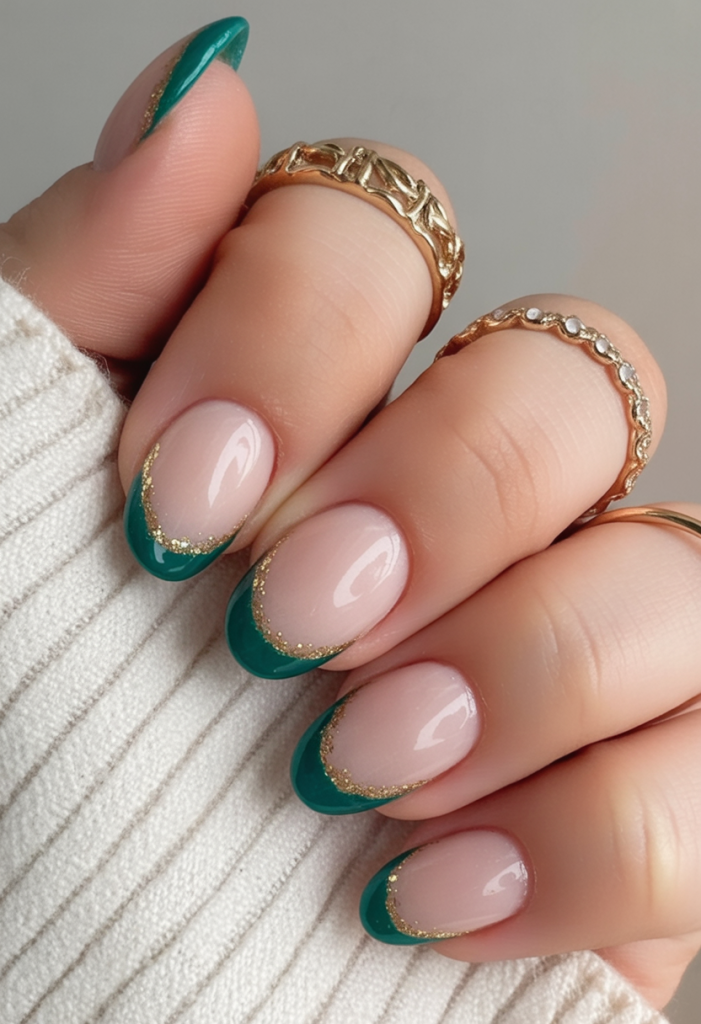 The classic French tips get a seasonal twist with dark green tips bordered by fine gold glitter. The soft nude base makes the green really pop, while the flashes of gold make it feel like a celebration. This look is classic with a modern twist and just enough detail for the festive kind of upgrade.