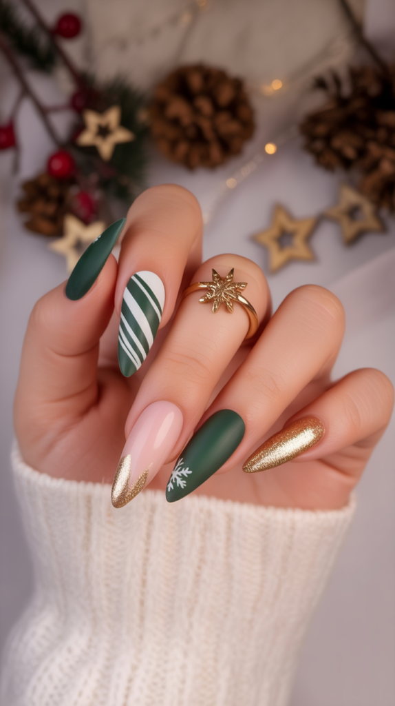 This manicure feels like a festive story on your fingertips: stripes, gold details, snowflakes, and matte green polish. Each nail has its own personality, but together they create a cohesive holiday design that feels warm, creative, and celebratory.