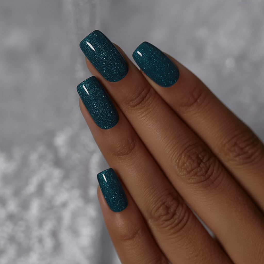 These shimmering square nails are like dark green glitter sparkling from every angle, resembling Christmas lights on a chilly evening. That glitter gives them a festive yet classy charm, especially for someone who is into slight glamour but just enough. They can go on as the perfect shine for holiday dinners, and at the same time, they are understated enough for everyday wear.