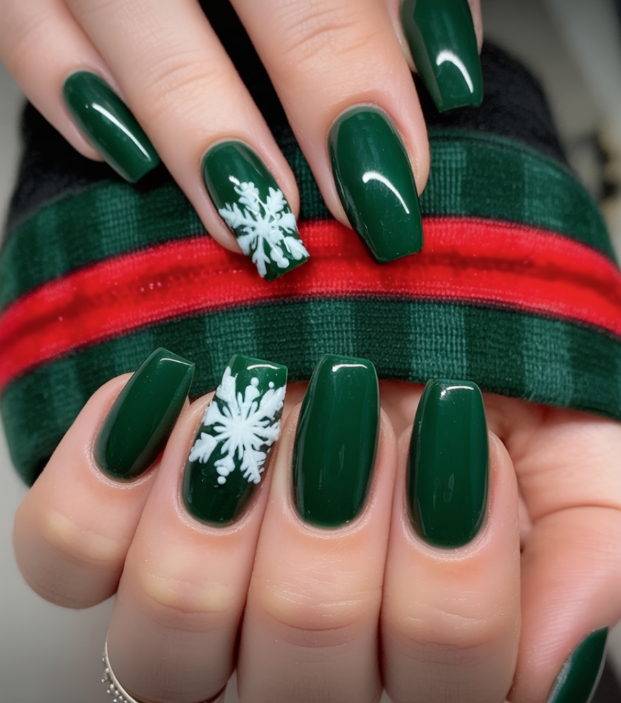 Get the feelings of this manicure; it is that holiday whimsy bottled in it. The matte finish in a deep green shade provides it with that modern edge, while the snowflake art and a Christmas gnome accent nail bestow a playful twist on it. It is cheerful and so unique — and it is surely worthy of compliments because, seriously, who could resist a little gnome?