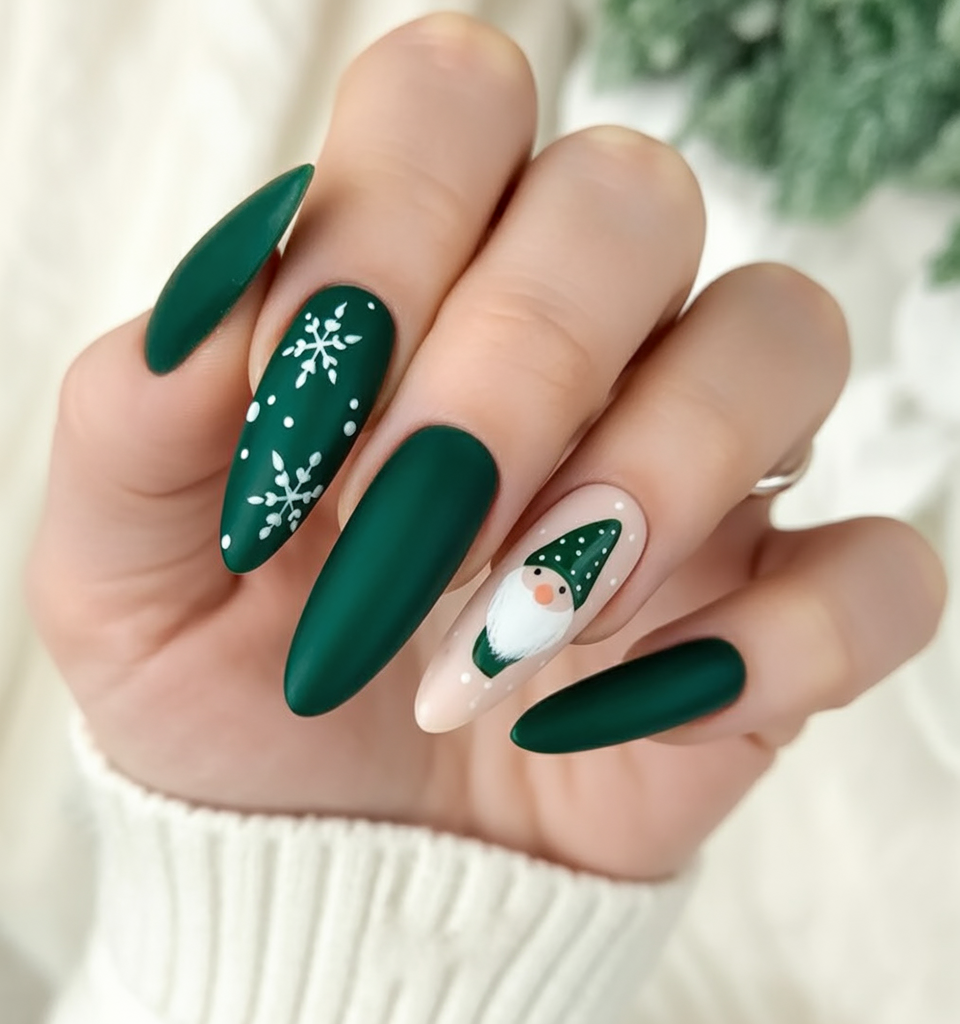 23. Matte Dark Green Almond Nails with Christmas Gnome