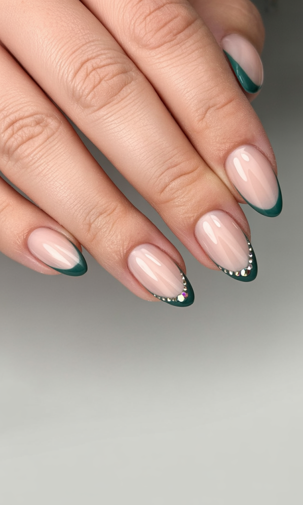 A modern take on traditional French tips, the almond nails come with dark green tips enhanced by a fine line of crystals. The nude base keeps the whole thing soft while the rhinestones elicit a little glamour—think of them as jewelry for the fingertips. The effect is elegant, a little playful, and perfect for making a subtle statement on those holiday evenings.