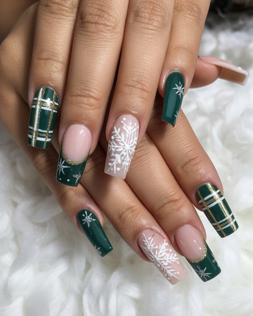 4. Plaid and Snowflake Square Nails in Dark Green and Gold