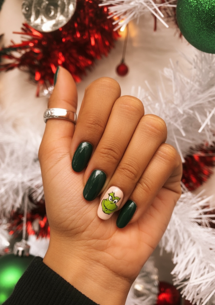 Sometimes the holidays call for a little humor, and these dark green nails deliver just that with a cheeky Grinch accent finger. The design is bold yet fun, adding a playful personality to your look while keeping the rest of the nails sleek and polished. It’s a perfect way to show your festive spirit without taking yourself too seriously.