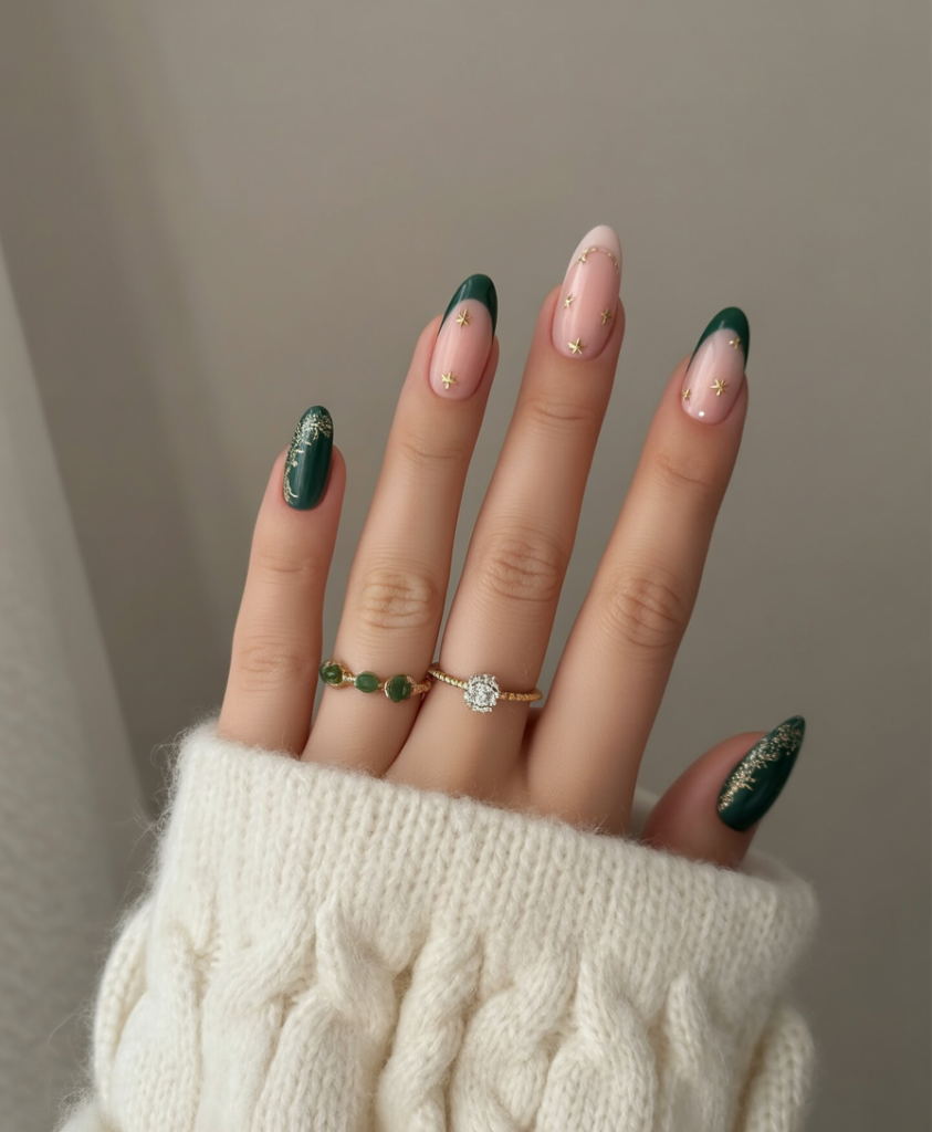 These nails feel straight out of a holiday fairytale. Dark green tips frame a soft nude base, while tiny golden stars twinkle across the design like a frosty night sky. The balance of green, nude, and shimmering gold makes them luxurious yet delicate-perfect for anyone wanting a subtle but festive sparkle.